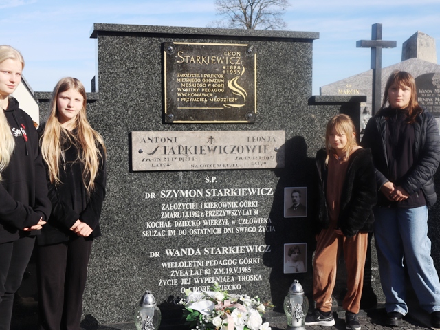 panem Adrianem Jamrożym odwiedzili cmentarz parafialny w naszym mieście. Zapalili znicze i złożyli wiązankę kwiatów na grobie założyciela szpitala „Górka” doktora Szymona Starkiewicza i jego żony Wandy Starkiewicz. W ciszy i skupieniu zapalili też znicze na grobach żołnierzy poległych