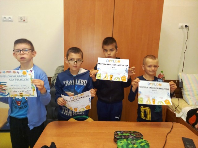 W tym dniu uczniowie z zespołu klas I- III szkoły podstawowej wzięli udział w konkursie „Mistrz Tabliczki Mnożenia”. Aby zasłużyć na ten tytuł musieli wykonać kilka zadań, m.in. wypełnić arkusze ćwiczeń, zagrać w „matematyczne” kości oraz sprawdzić znajomość tabliczki mnożenia